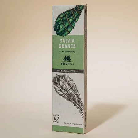 Composição: Blend terapêutico Nirvana (mix de resinas naturais, ervas, óleos essenciais e especiarias), varetas de bambu, pó de madeira, aglutinante, fragrância de capim limão e gengibre.